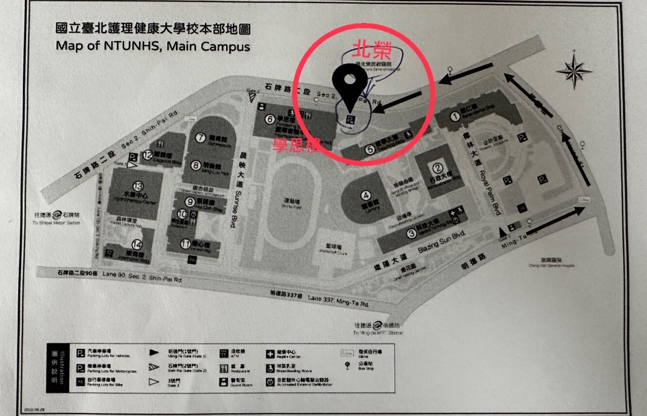 請您由北榮醫院正對面車道進出,主辦單位將提供免費停車券使用。 若停放於其他區域,則無法使用免費停車券,敬請留意。